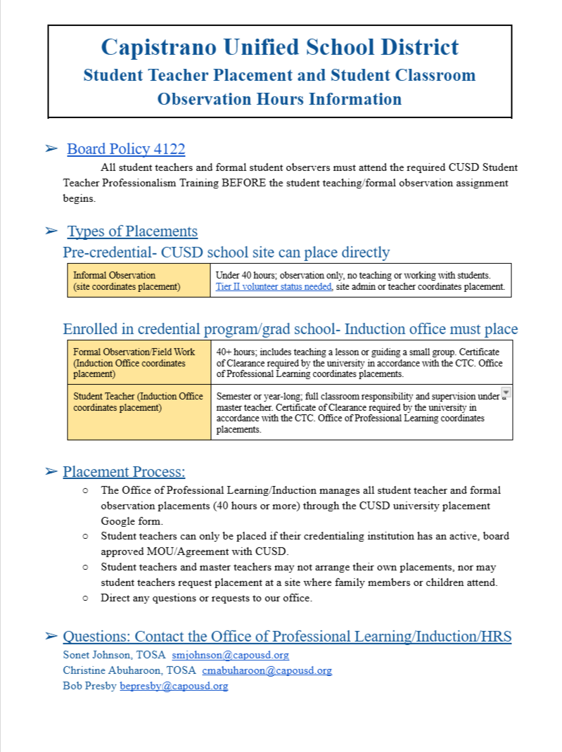 Student Teachers are placed through the Office of Induction. Per CUSD Board Policy 4122, all student teachers and formal fieldwork observers must attend a CUSD Professionalism Training prior to the start of their assignment at a CUSD school site. All student teachers and formal field work observers must have a Certificate of Clearance on file with the CTC. University placement coordinators work directly with the Office of Induction to request placements. Student teachers should not reach out to principals or potential master teachers. Only informal academic observers who are not enrolled in teacher credentialing program may contact school office managers to arrange informal academic observations of less than 40 hours per semester. Informal observers must fill out a Tier 2 Volunteer Clearance form prior or starting observations. CUSD has MOUs with several universities who we partner with for student teacher placements. Please contact Sonet Johnson at smjohnson@capousd.org with any questions you might have.